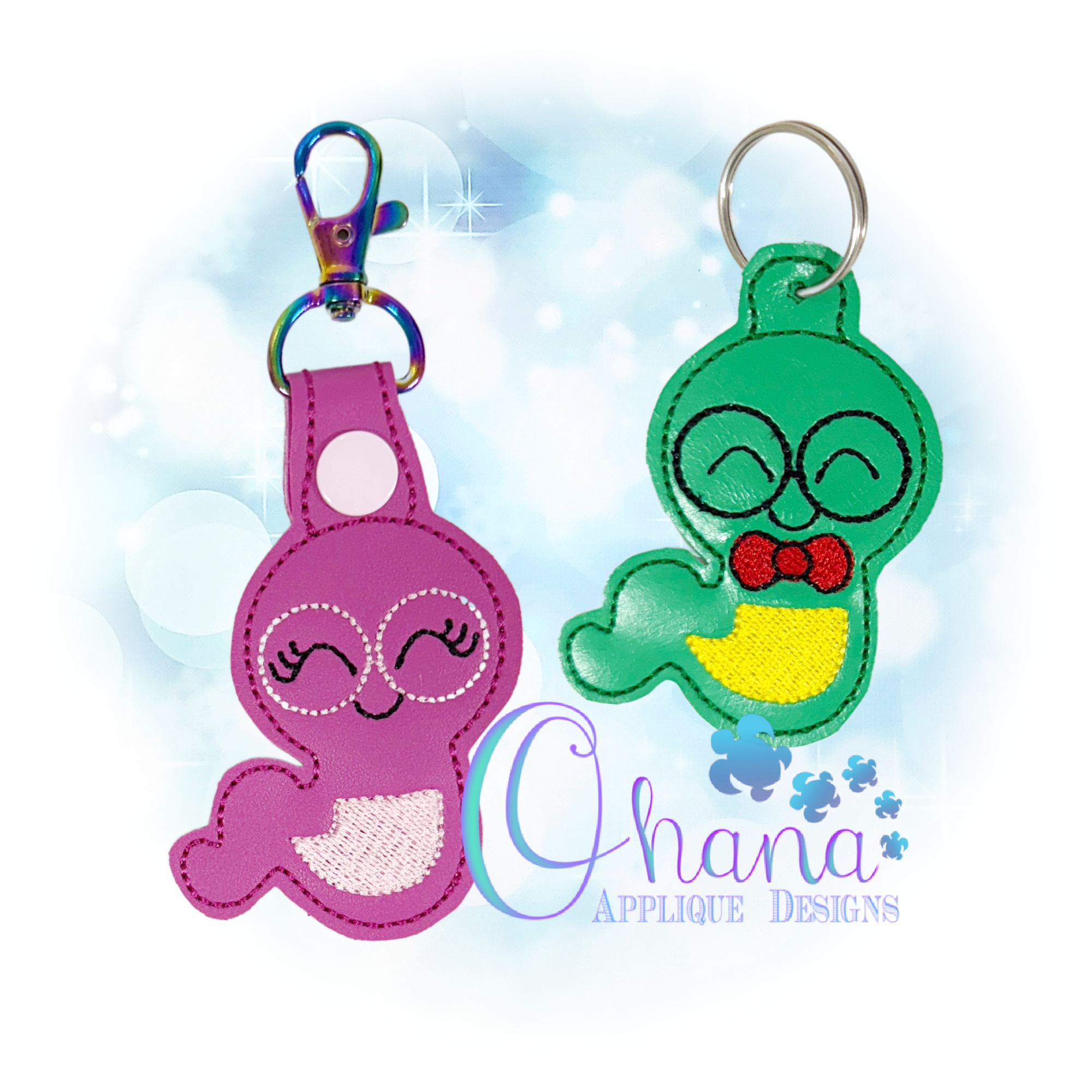 Stitchers can stitch these cute In The Hoop designs quickly and easily! After the machine stitches the design, you simply cut it out and add snaps, rivets, eyelet grommets with a split ring or lobster claw clip!