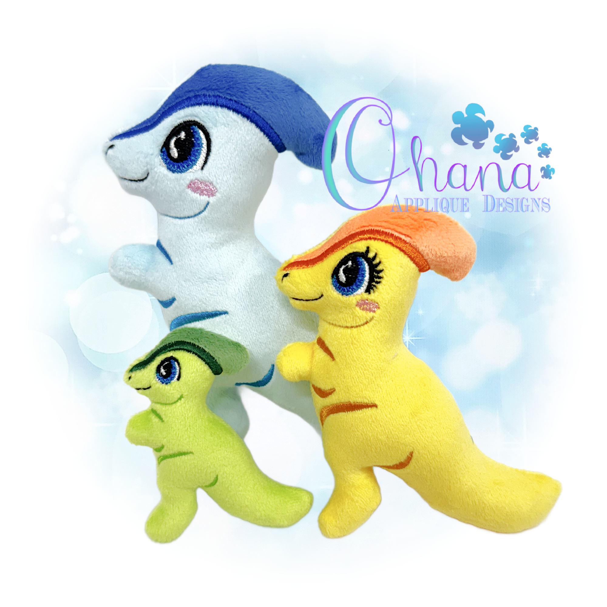 You will find the following hoop sizes are included for the Pierce Parasaurolophus Stuffie Embroidery Design.