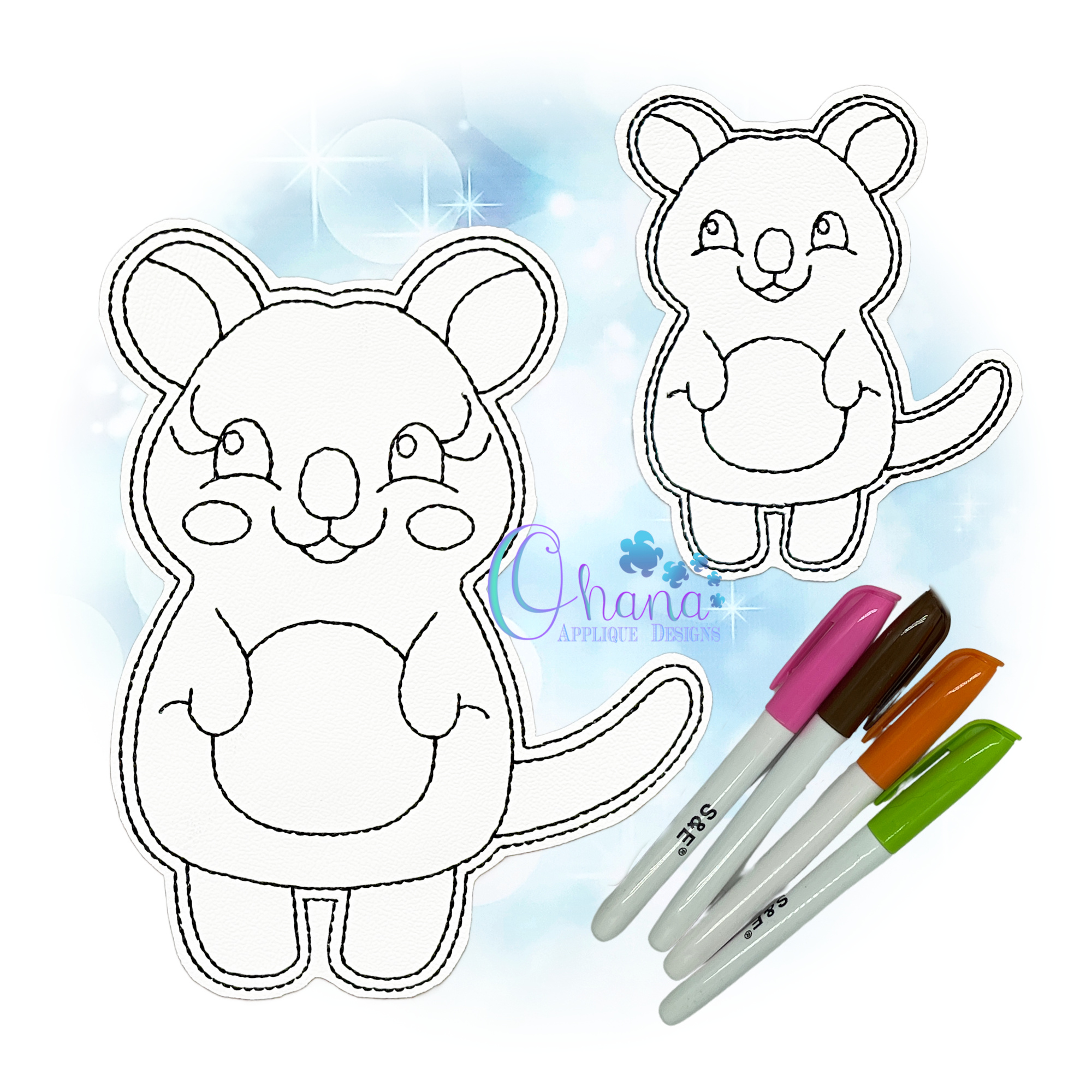 Stitchers can complete this creative Quokka Flat Coloring Doll design in one easy hooping. You will find this project is beginner friendly. Purchasers will also find a helpful chart in JPG form included as well as PDF written instructions. Embroiderers can also find tons of encouragement and ideas in our fabulous Facebook Fan Group as well!