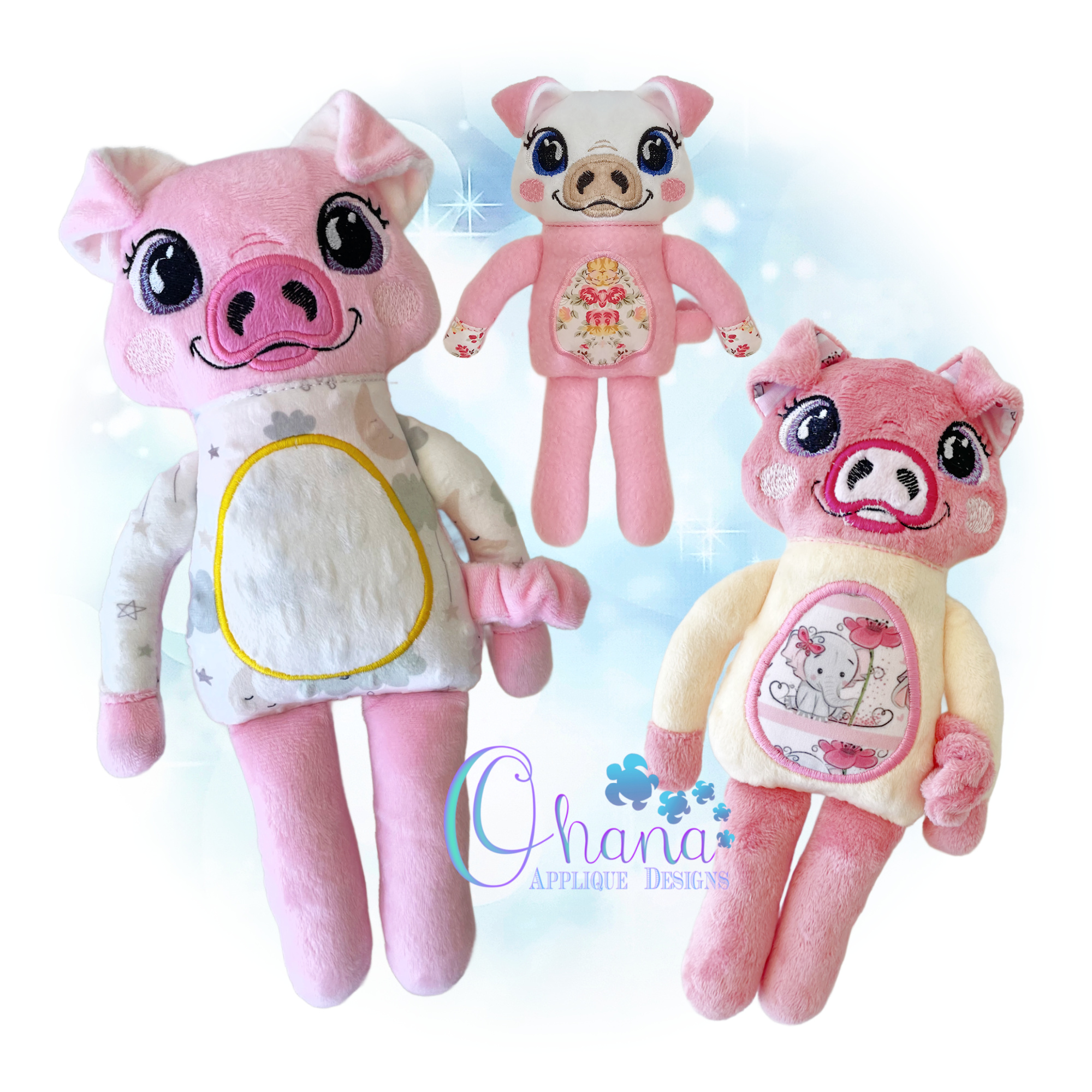 You will find the following hoop sizes are included for the Rag Doll Pig Stuffie Embroidery Design.