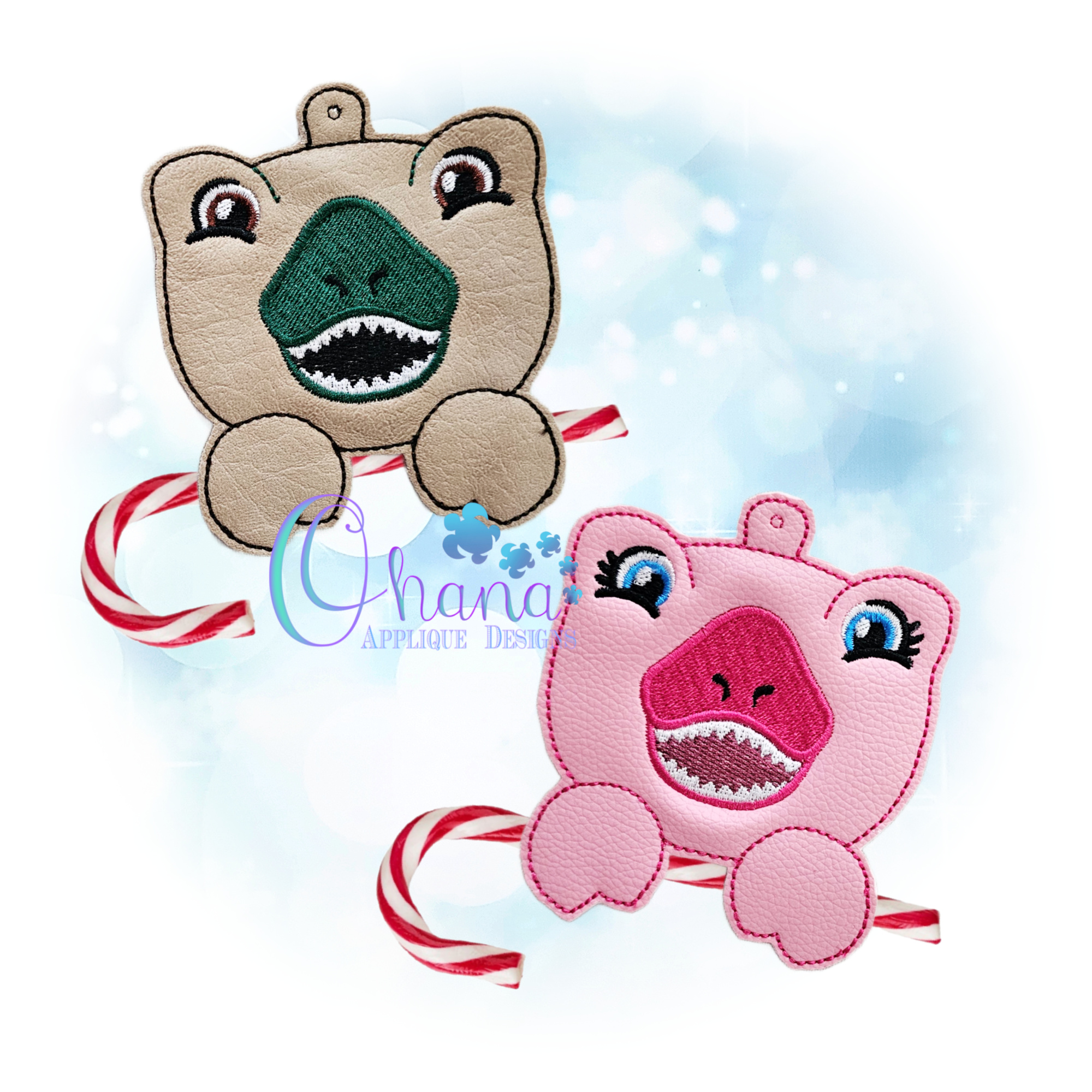 This cute little T Rex Single Candy Cane Holder Ornament embroidery design is a perfectly great way to personalize your tree. You will find it can be added to a plastic or real regular sized candy cane!